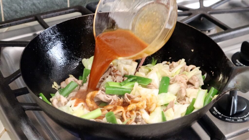 Aštri miso kiauliena ir kopūstai yra maišoma ir lengvai troškinta patiekalas, kuriame yra švelni kiauliena ir kopūstai, padengti pikantišku, miso pagrindu pagamintu aštriu padažu. Jį įkvėpė „Hoi Ko Ro“ (回鍋肉 回鍋肉), klasikinis „Sichuan“ stiliaus patiekalas, dažnai pritaikytas Japonijos ir Kinijos restoranuose. Turtingas, aštrus miso skonis gražiai poros su garintais ryžiais, todėl tai yra populiarus meniu kuokštelinis užkandis „Eateries“ ir jauki, jauki, patenkinanti vakarienė, kuria galima mėgautis namuose.